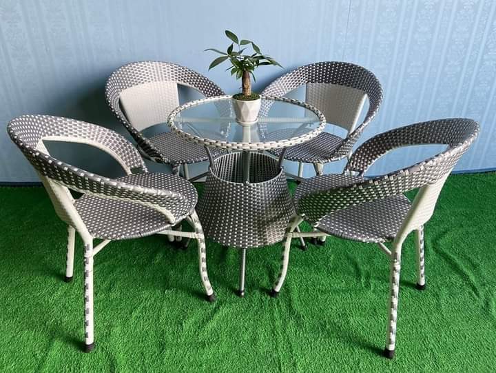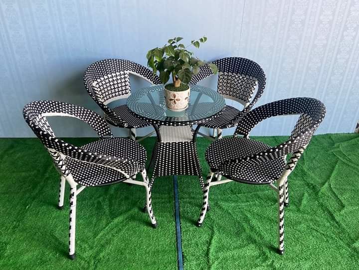 Chất liệu khung sắt đan nhựa, mặt bàn kính.
